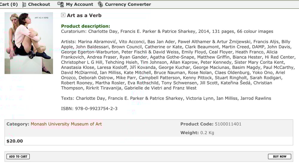 Marina Abramović, Vito Acconci, Bas Jan Ader, Paweł Althamer & Artur Źmijewski, Francis Alÿs, Billy Apple, John Baldessari, Brown Council, Catherine or Kate, Clark Beaumont, Martin Creed, DAMP, Aleks Danko, John Davis, Harold Dover, George Egerton-Warburton, Peter Fischli & David Weiss, Emily Floyd, Ceal Floyer, Heath Franco, Alicia Frankovich, Andrea Fraser, Ryan Gander, Philip Gerner, Agatha Gothe-Snape, Matthew Griffin, Bianca Hester, Hi Red Center, Christopher L G Hill, Tehching Hsieh, Tim Johnson, Allan Kaprow, Peter Kennedy, Mike Parr, Sister Mary Corita Kent, Anastasia Klose, Laresa Kosloff, Jiří Kovanda, George Kuchar, George Maciunas, Basim Magdy, Paul McCarthy, David McDiarmid, Ian Milliss, Kate Mitchell, Bruce Nauman, Rose Nolan, Claes Oldenburg, Yoko Ono, Ariel Orozco, Jill Orr, Deborah Ostrow, Campbell Patterson, Kenny Pittock, Stuart Ringholt, Sarah Rodigari, Robert Rooney, Martha Rosler, Eva Rothschild, Tony Schwensen, Jill Scott, Kateřina Šedá, Christian Thompson, Rirkrit Tiravanija, Ken Unsworth, Gabrielle de Vietri, Franz West