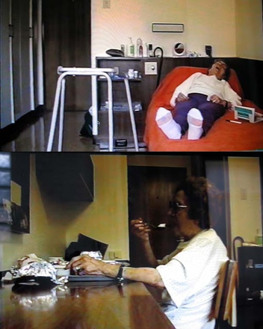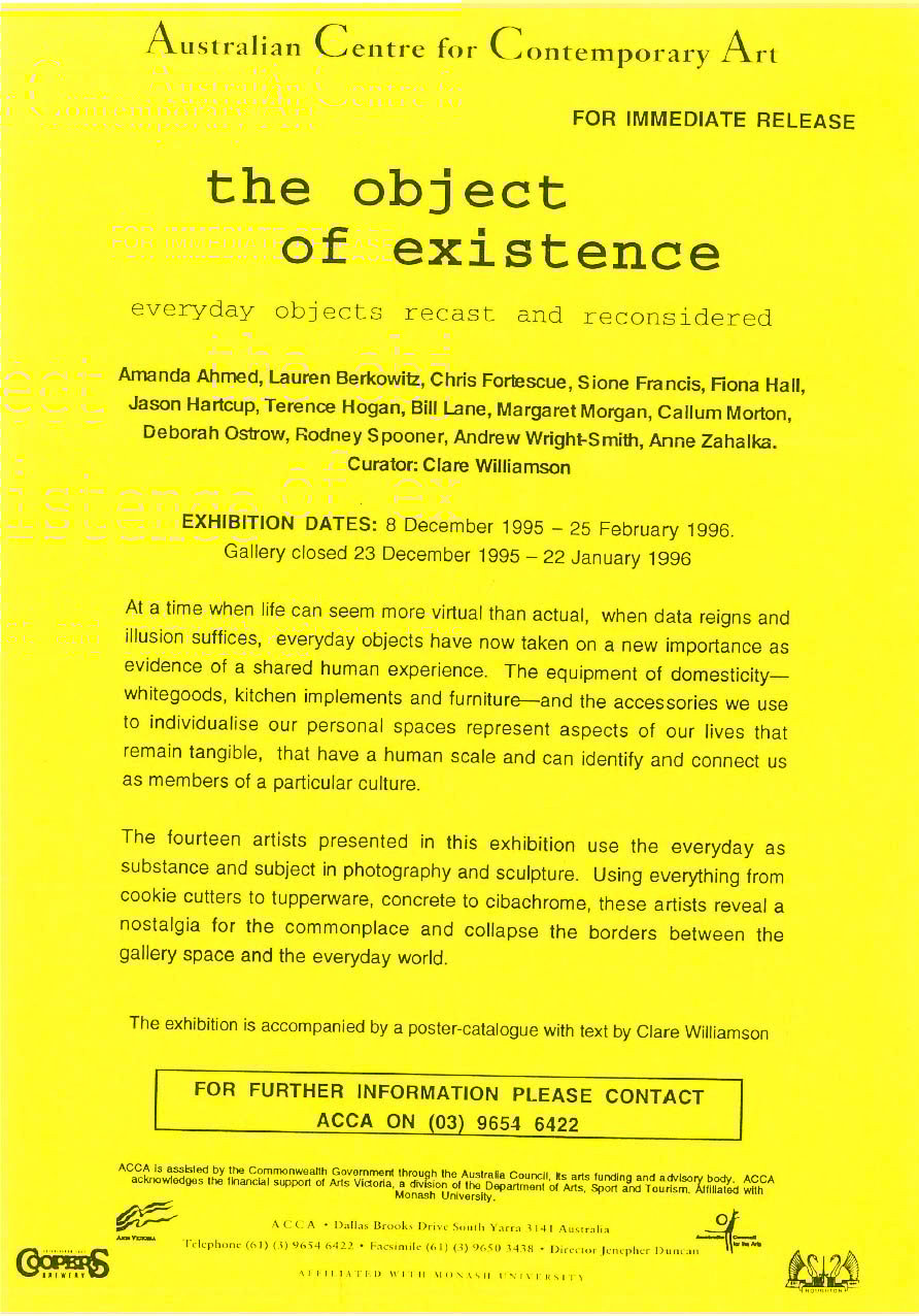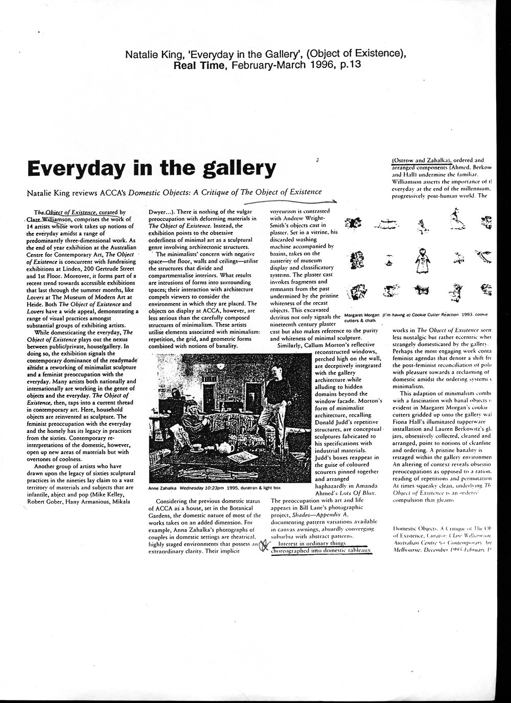 Amanda Ahmed and Deborah Ostrow borrow statistically from Mondrian's oeuvre, turning the motif of utopian modernism back upon itself. Ahmed's construction, Lots A' Blocks, resembles Mondrian's Pier and Ocean paintings and is made from brightly coloured kitchen scourers, Ostrow's video depicts her grandmother going through the motions of eating and sleeping in her first week in a home for the aged. The symbolic representation of a perfectly ordered and equal society is re-presented by these two emerging artists translated into the domestic or institutional environments in which utopian painters, designers and architects imagined that their project would be realised. Both works present the everyday enacted with a gridded and regular environment and reveal the repetition and paucity of an existence within it.